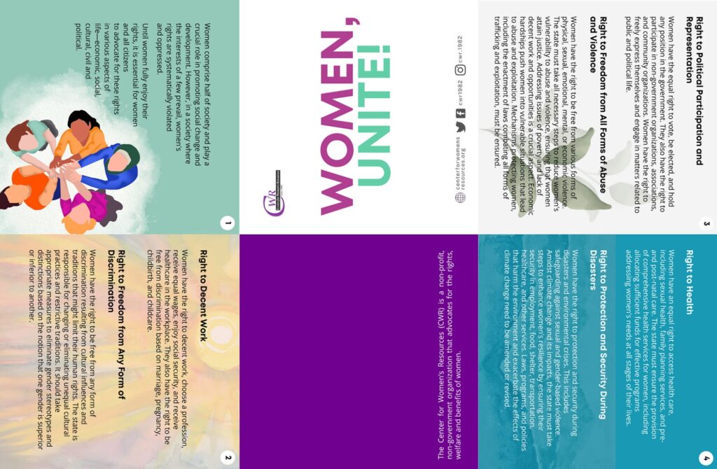 Women comprise half of society and play a crucial role in promoting social change and development. However, in a society where the interests of a few prevail, women’s rights are systematically violated and oppressed. Until women fully enjoy their rights, it is essential for women and all citizens to advocate for these rights in various aspects of life—economic, social, cultural, civil, and political.